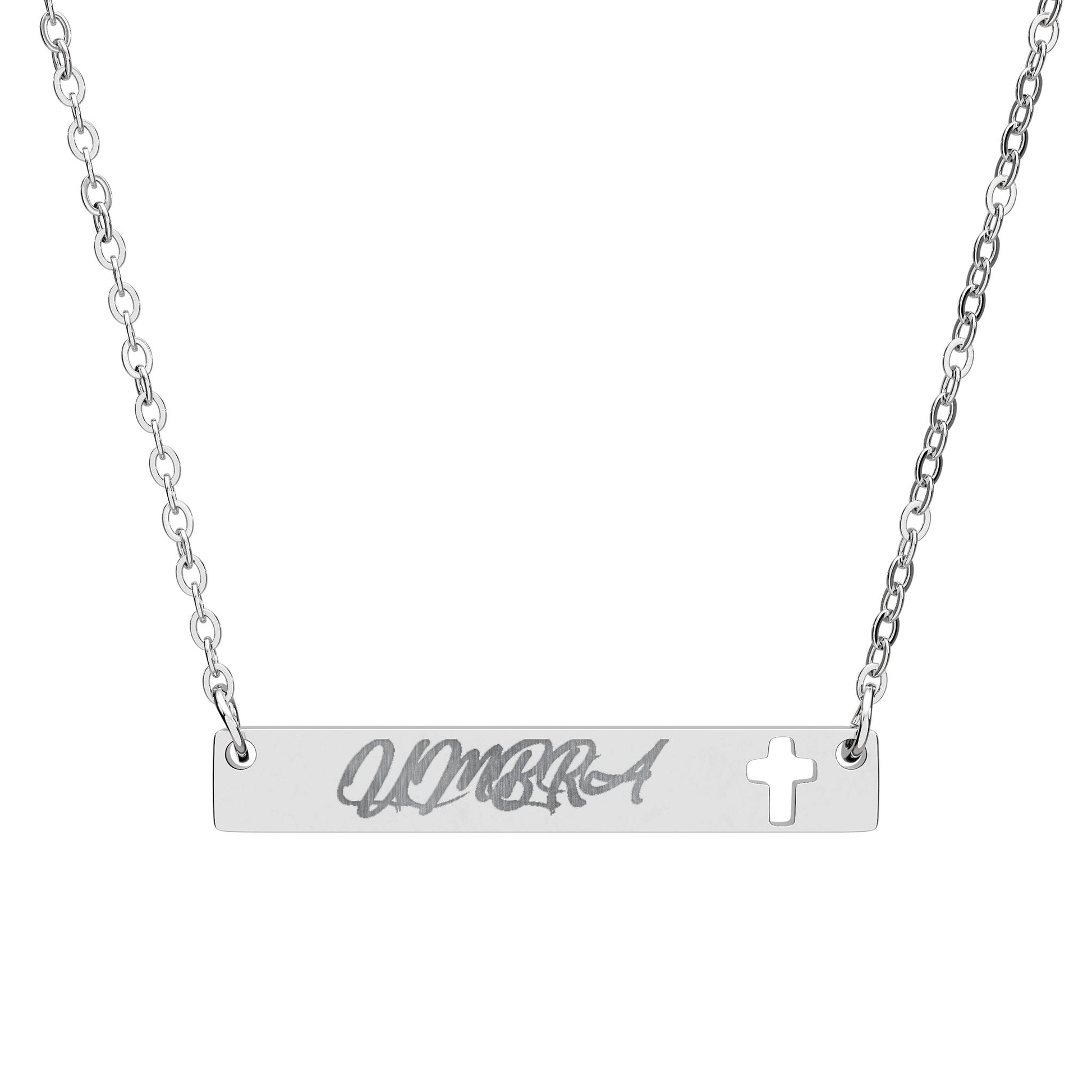 A slim, engraved orizontal bar necklace that carries a quiet confidence. The pendant hangs close to the chest on a simple chain, its laser-etched design offering a textured, permanent mark that reads like a personal signature. Made from 316L surgical-grade stainless steel with optional PVD finishes, the piece resists rust and keeps its polished look through daily wear. Lightweight and hypoallergenic, it sits comfortably against skin and layers easily with other necklaces — a subtle, wearable detail that feels both modern and meaningful